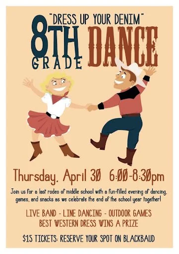 Our 8th grade dance is coming on Thursday, April 30 from 6:00-8:30 pm at The Gathering Place and outside patio. This event is designed to be an “end of year” party, a last rodeo for our TCS 8th graders. Please note that dates/guests are not permitted. Instead, we encourage our students to come and enjoy a night of country-themed fun as a group social. More details to come, but mark your calendars now.
