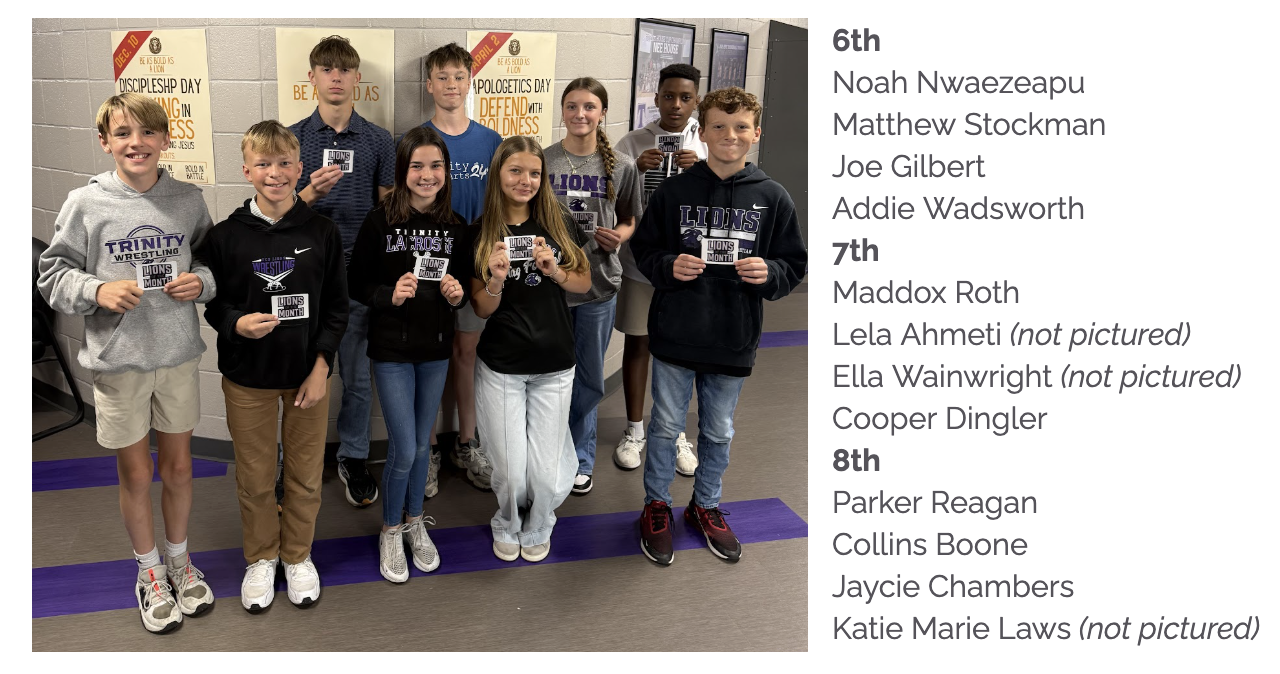 For February, the theme was Bold as a Lion, as students were challenged to live out our spiritual theme of righteousness. The students below were nominated by their teachers: