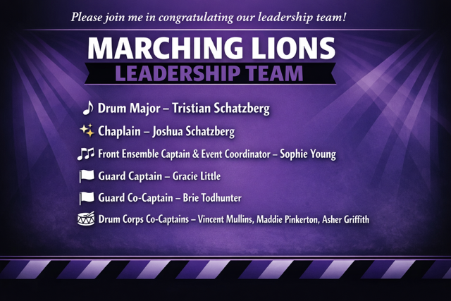 We are excited to announce our 2026 Marching Lions Leadership. We know that each of them will bring great value and strong leadership in this season. We can’t wait to see them grow and shine through their roles. Congratulations!